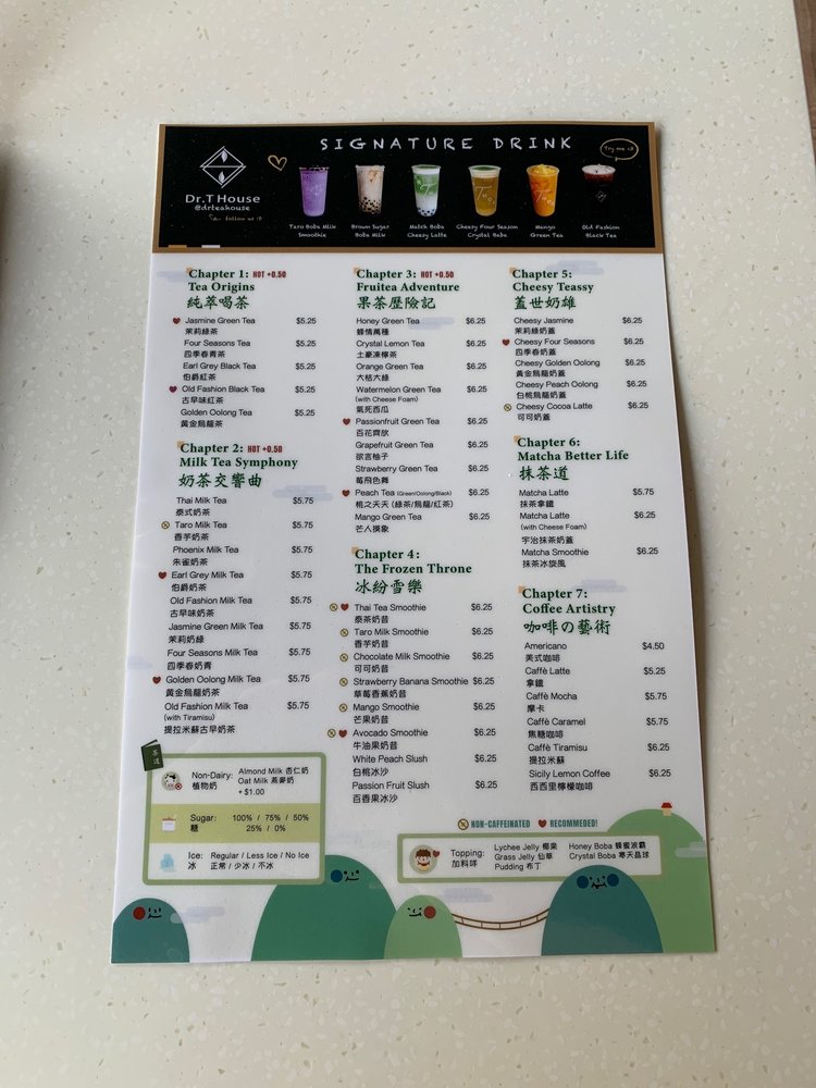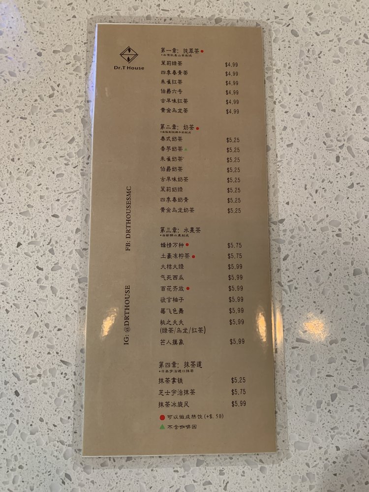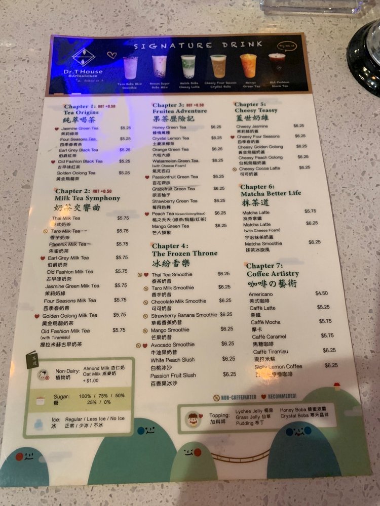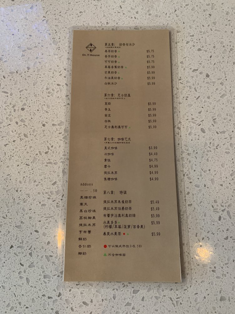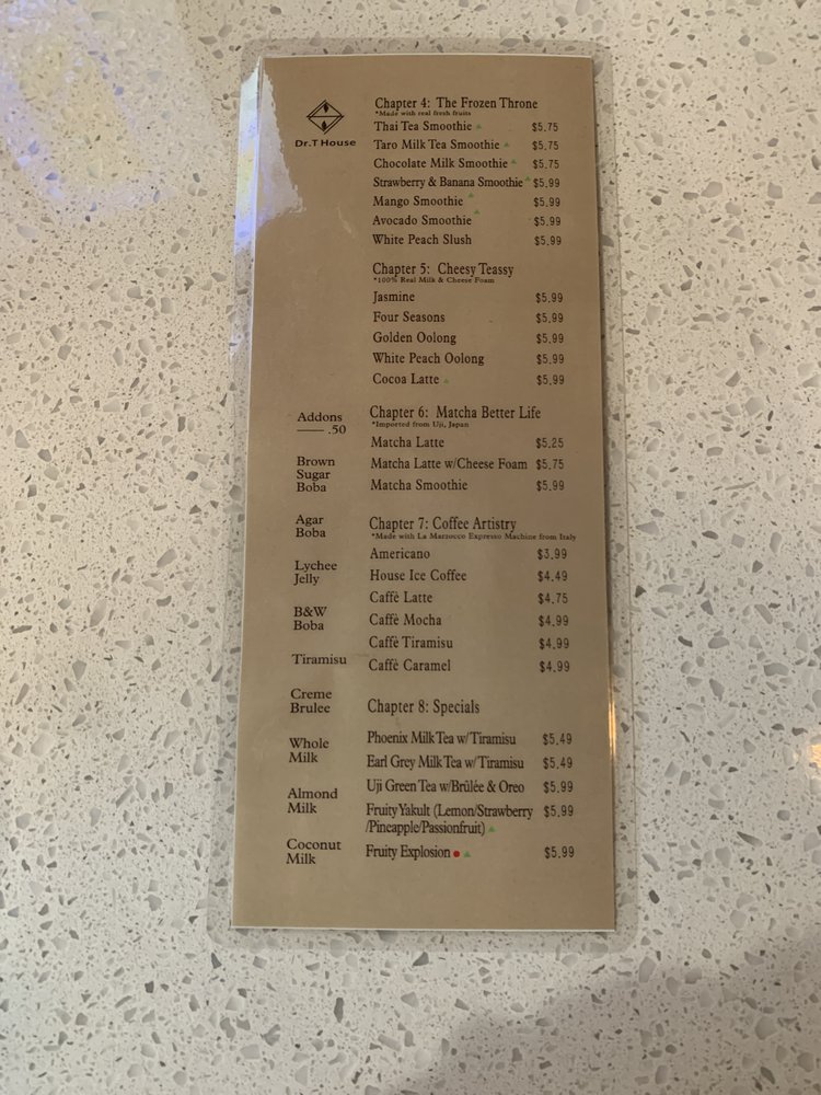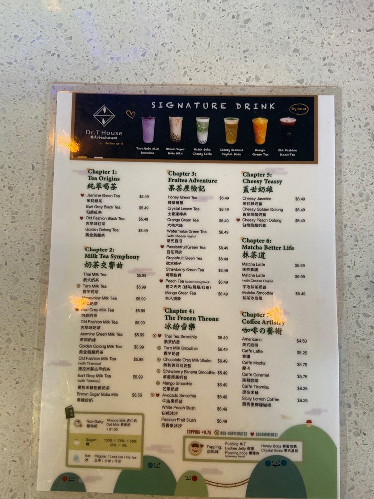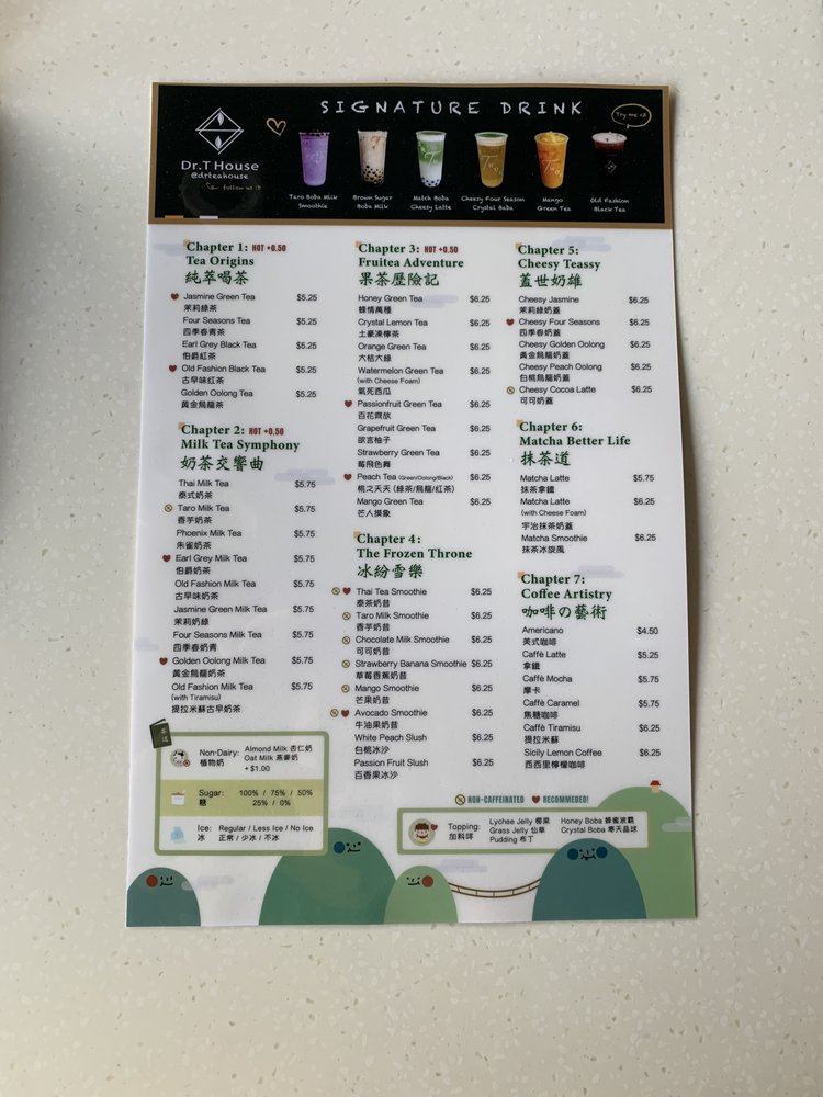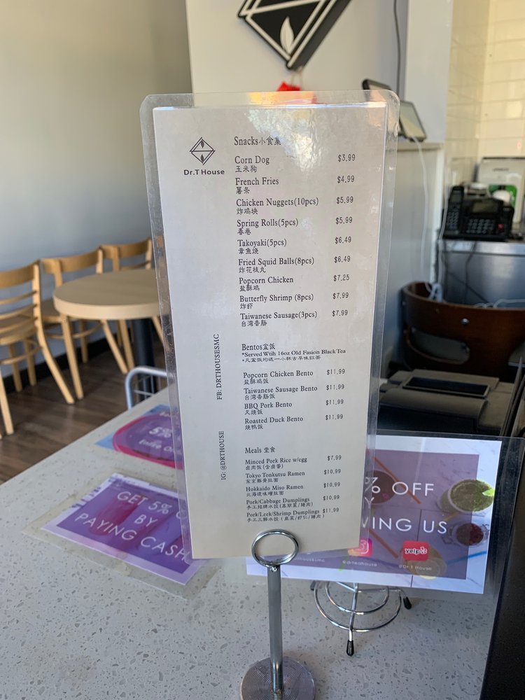 Dr T House is a Taiwanese bubble tea and juice bar located in Santa Monica, CA. This classy establishment offers a wide range of beverages and snacks, including Thai milk tea, strawberry banana smoothies, and crispy popcorn chicken with chili and garlic sauce. Customers rave about the friendly staff, cute interior, and community support shown by the owners. The menu features boba drinks, smoothies, and unique happy hour specials. The shop also provides a variety of amenities such as outdoor seating, free Wi-Fi, and compostable containers. Whether you're looking for a refreshing drink or a tasty snack, Dr T House is the place to be for a delightful dining experience. Don't miss out on trying their signature drinks and enjoying the welcoming atmosphere of this gem in Santa Monica.